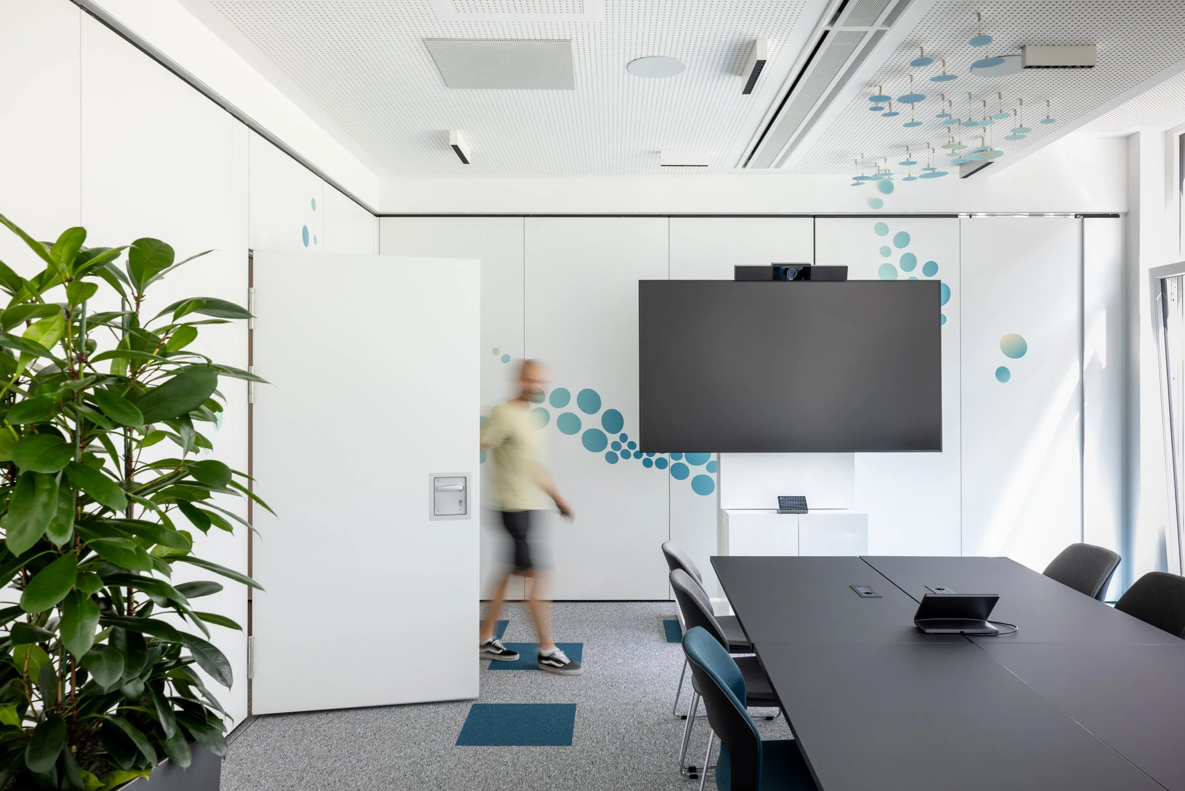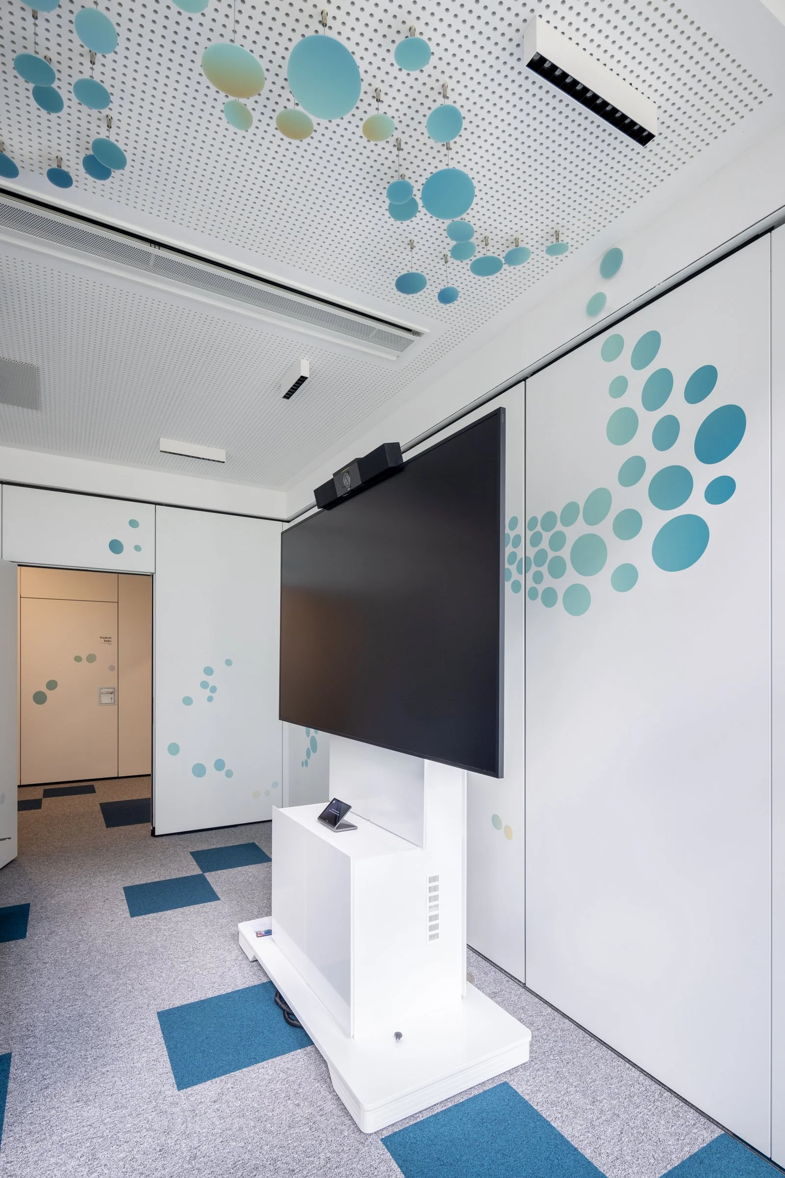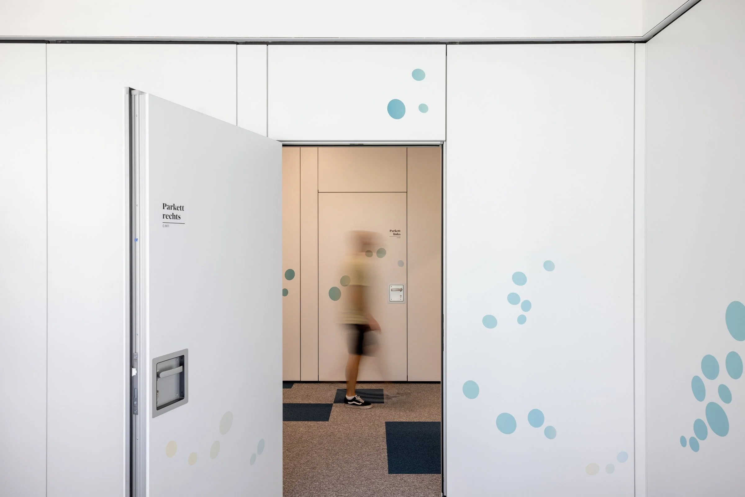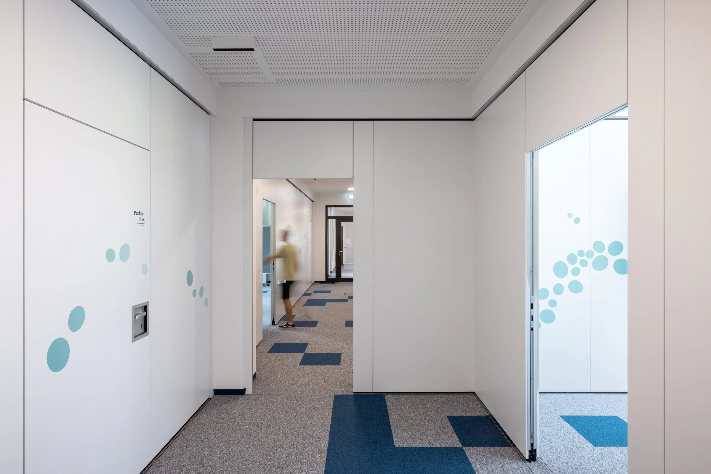 Der große Raum lässt sich durch Schiebeflächen in einzelne Bereiche unterteilen. Ovale Formen lassen den eindruck einer fließenden bewegung entstehen, die sowohl in den einzelnen Räumen, als auch im Gesamten wirkt. Während Die Schiebeflächen mit folie beklebt sind, wurden die festen Wände mit bedrucktem Acrylglas ausgestattet.