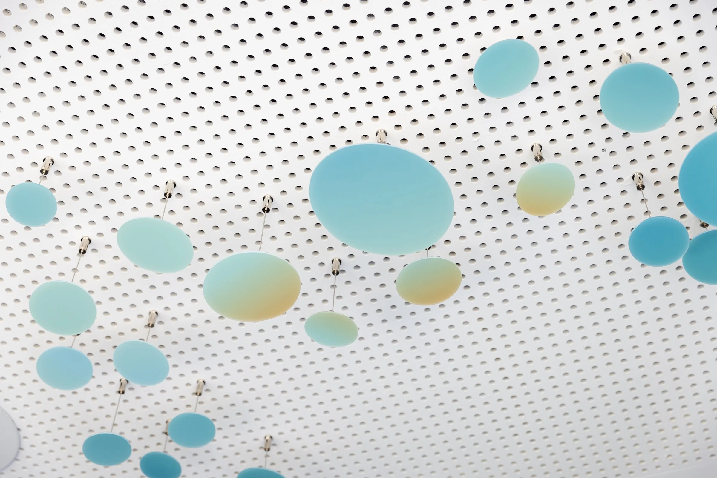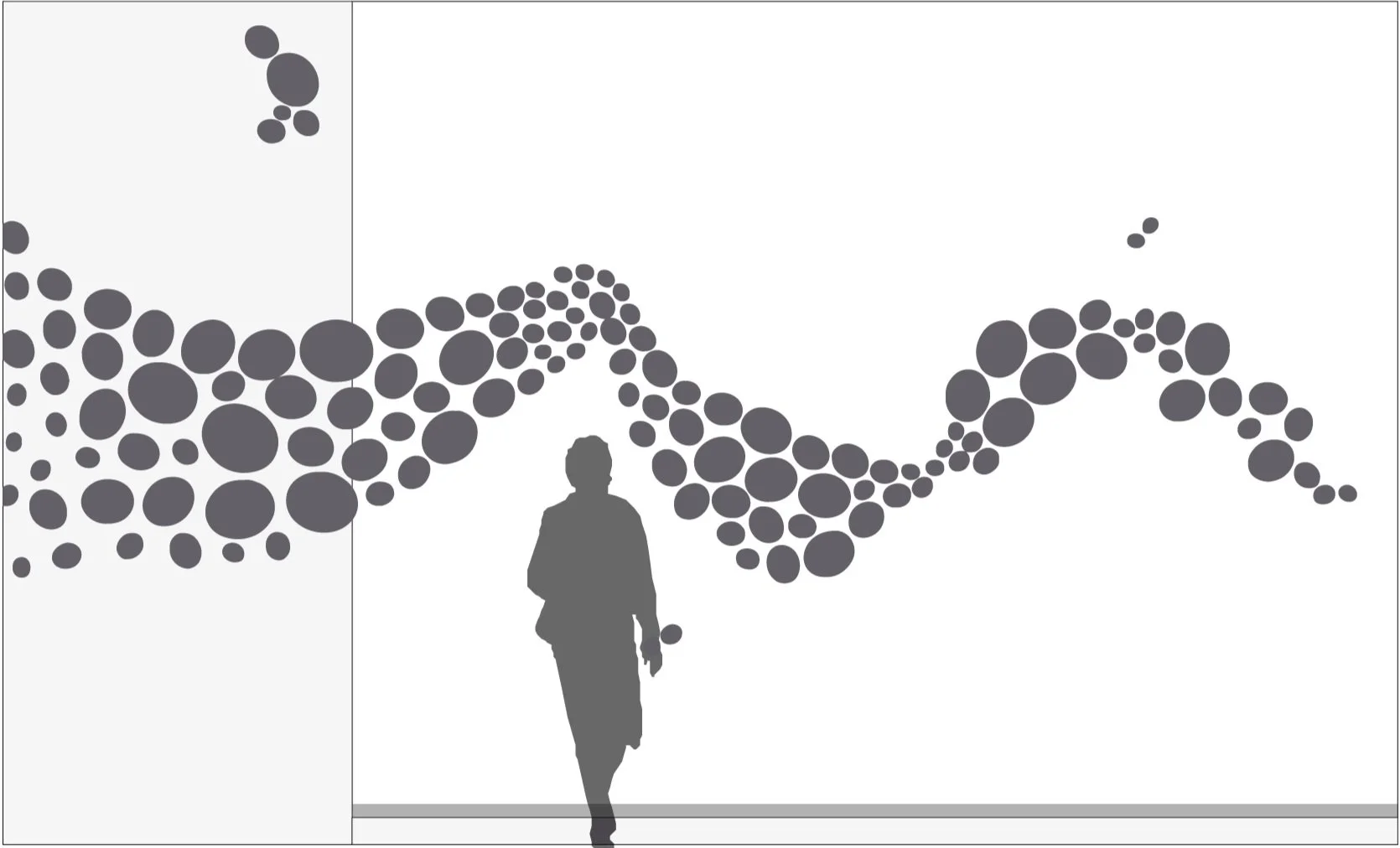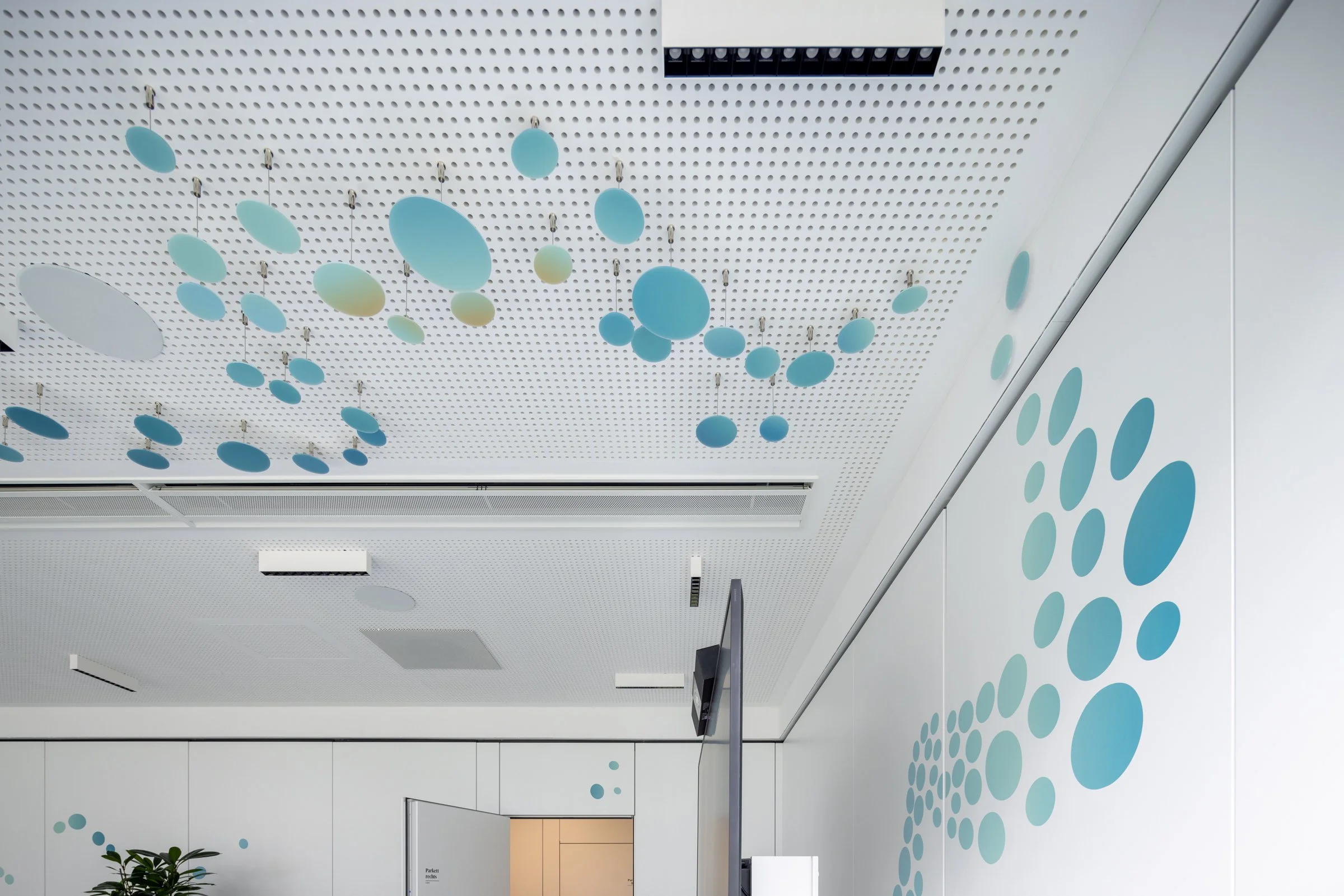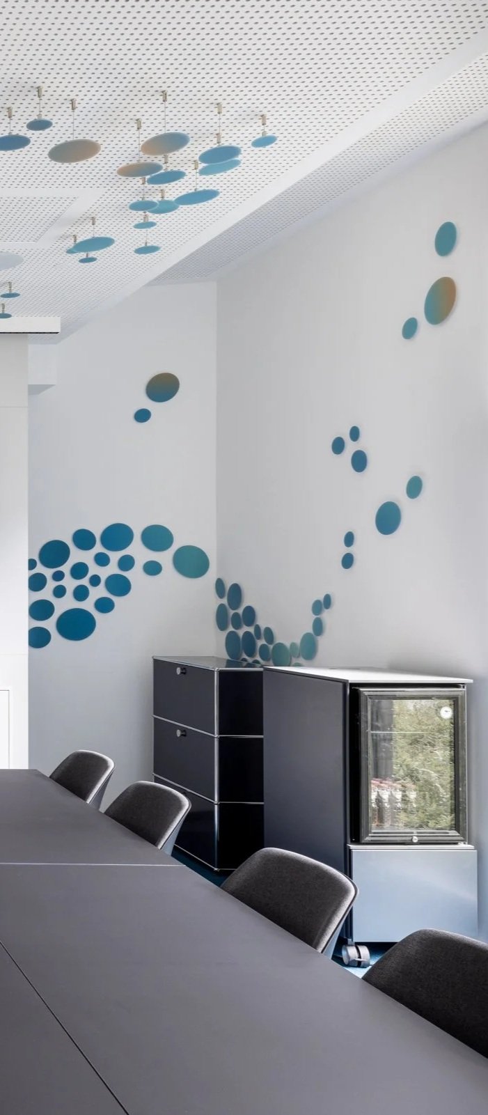 Für den neuen Standort des Deutschen Milchkontors (DMK) durften verschiedene Raumkonzepte entwickelt werden. Eines davon basiert auf dem Leitgedanken „Im Fluss“ und visualisiert einen abstrakten Milchfluss, der sich von den Wänden bis an die Decke erstreckt.