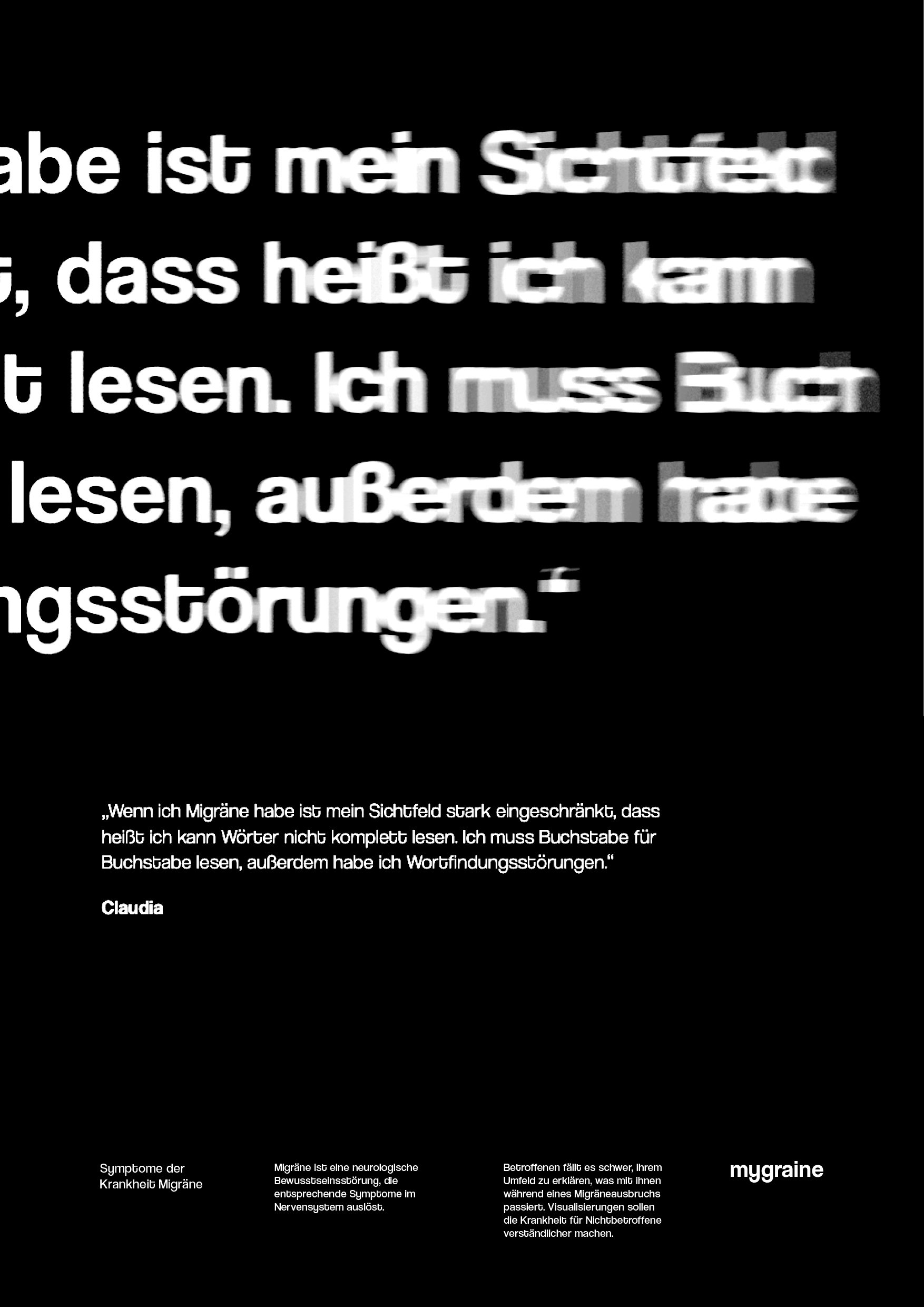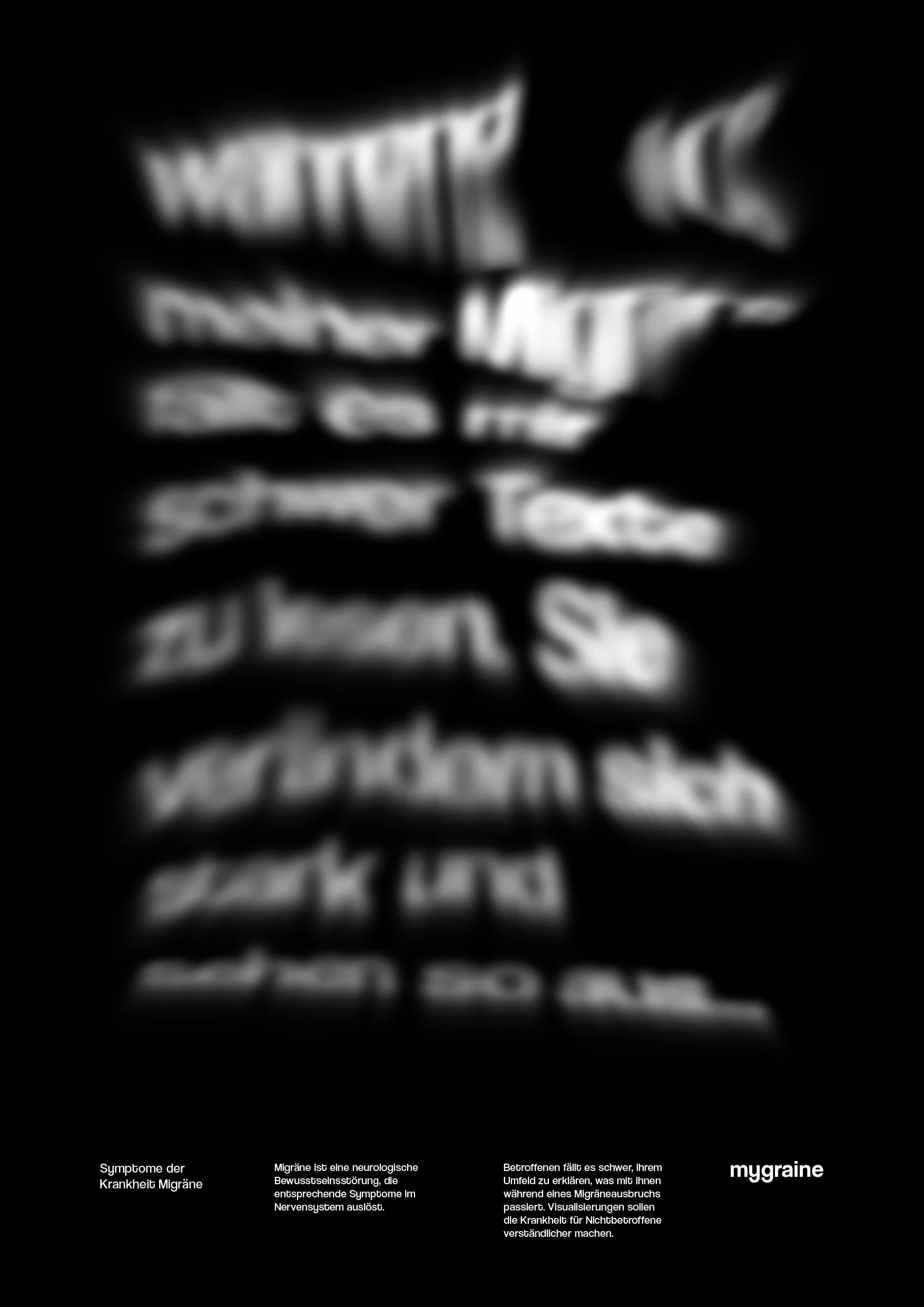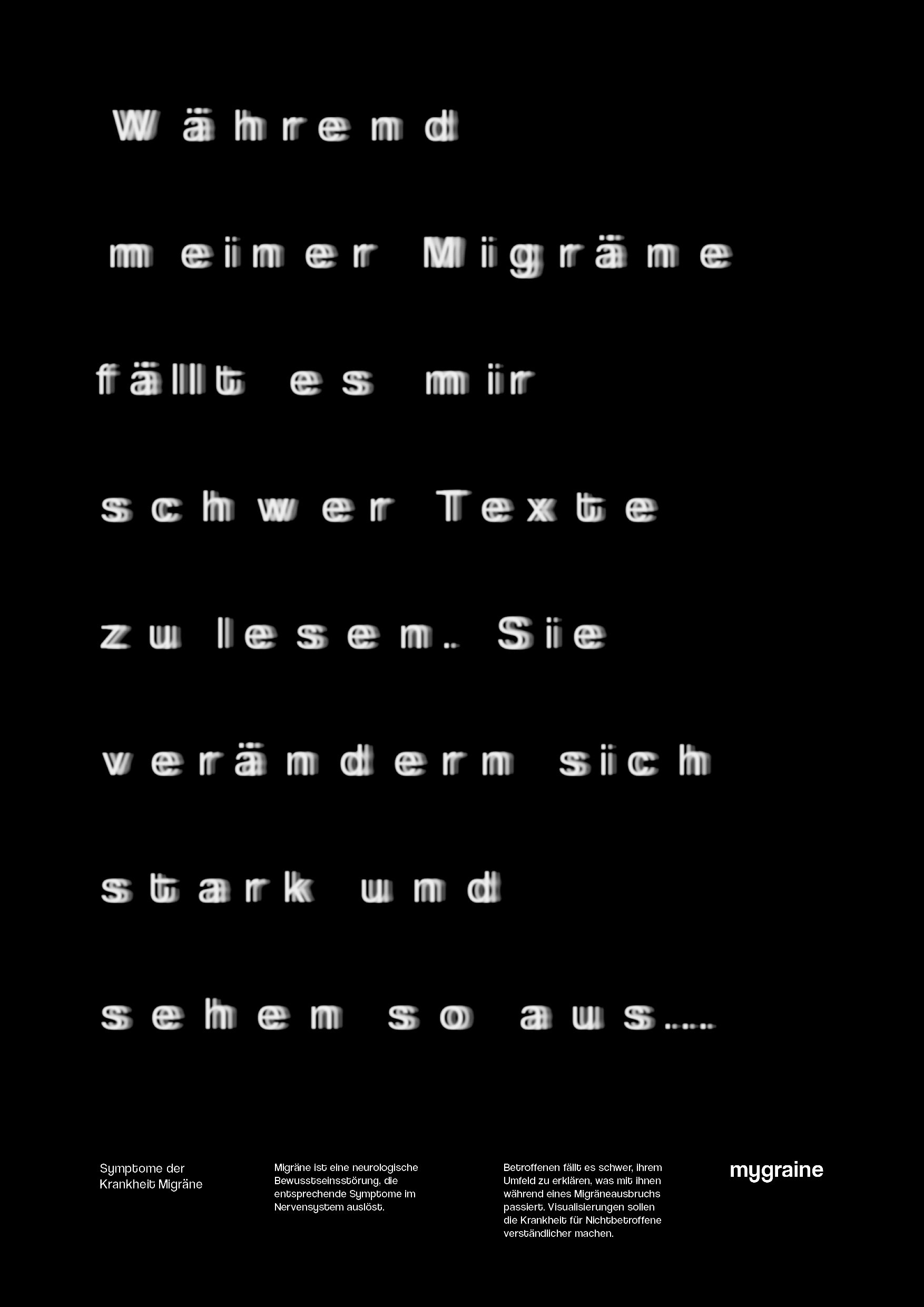 Für meine Bachelorarbeit habe ich mich mit Migräne, einer neurologischen Bewusstseinsstörung beschäftigt. Betroffenen fällt es oft schwer zu erklären, was während eines Migräneschubs passiert. mittels verschiedener Visualisierungen habe ich versucht zu zeigen, was sich Nichtbetroffene nur schlecht vorstellen können.
