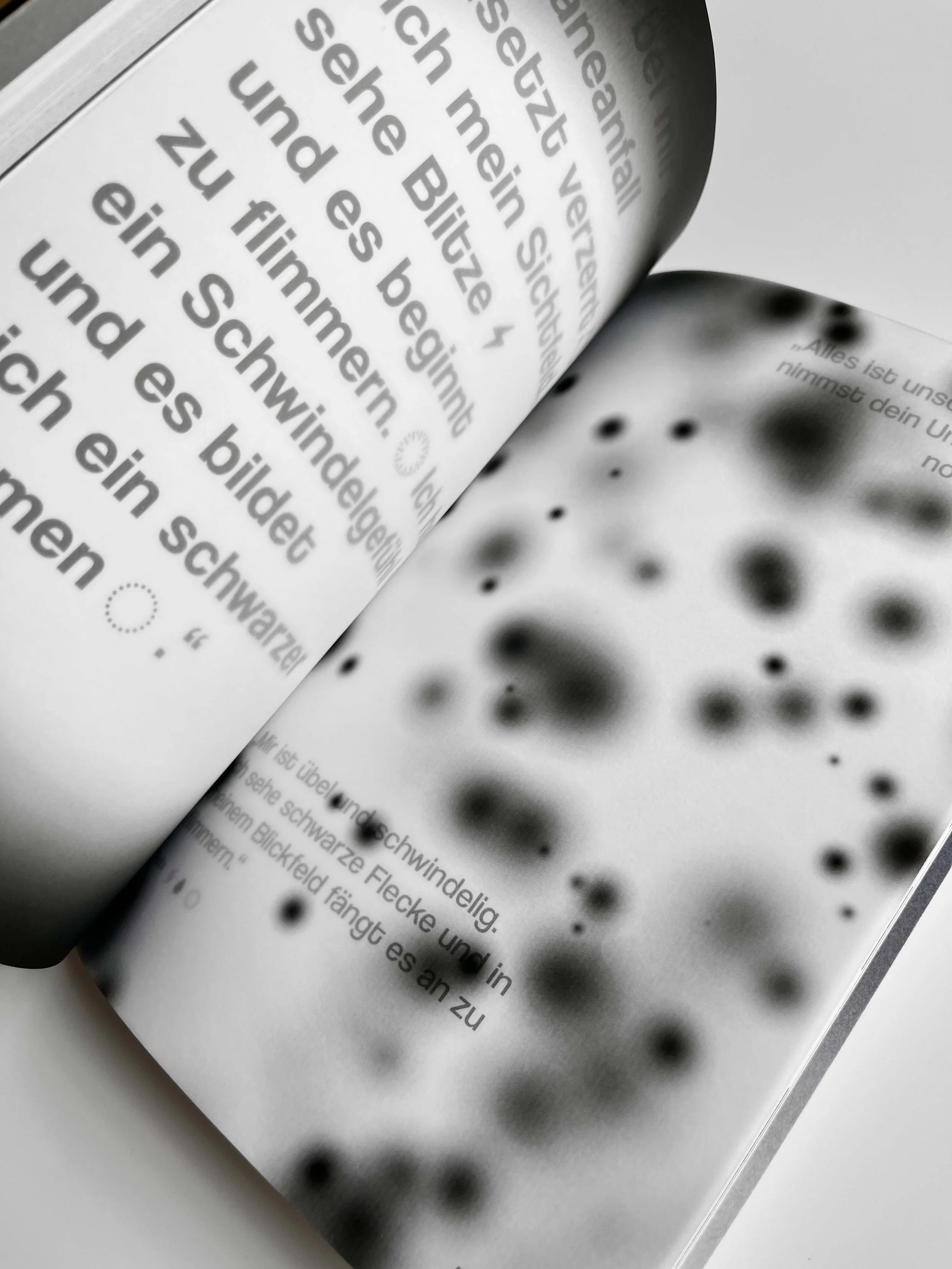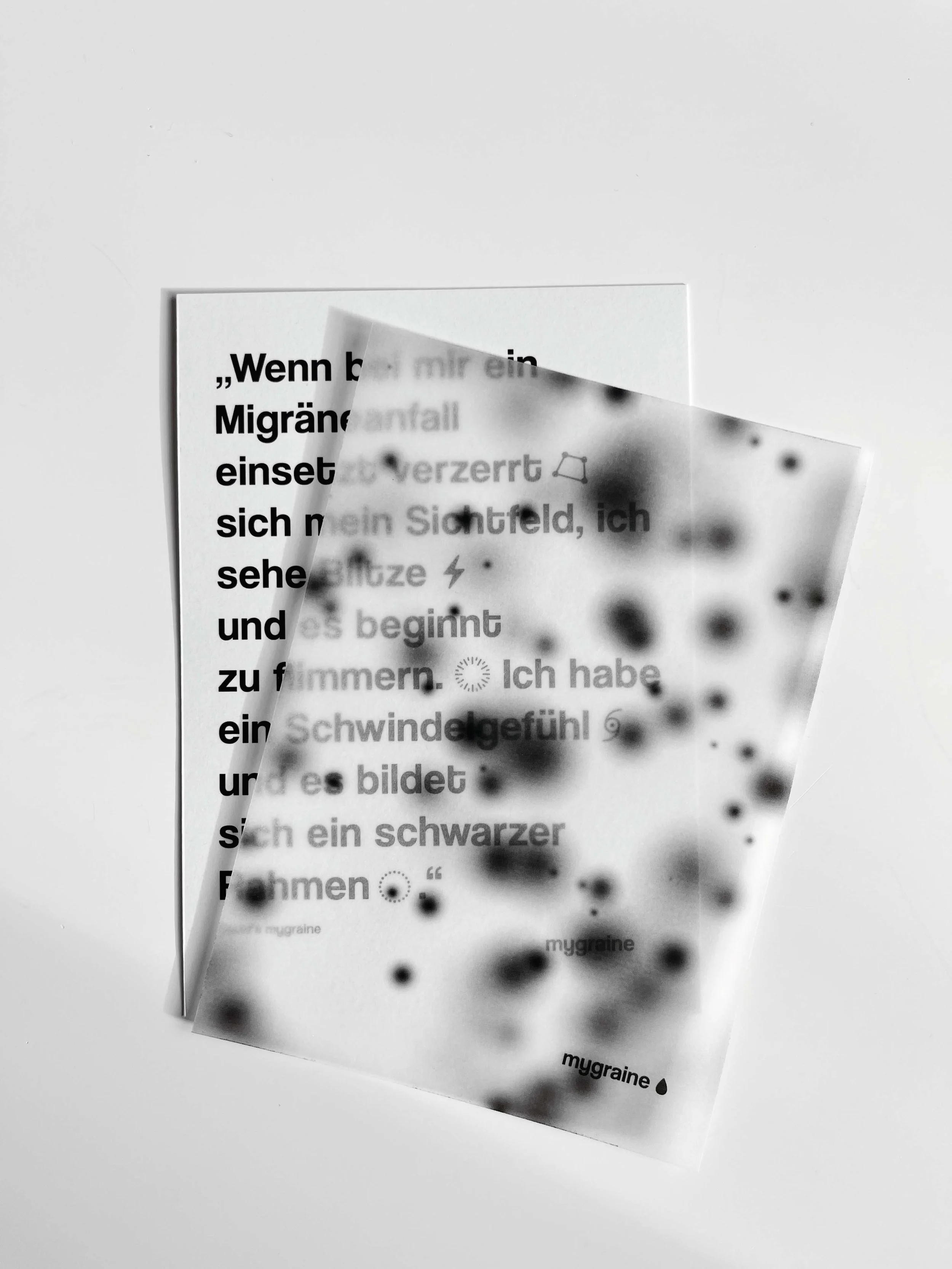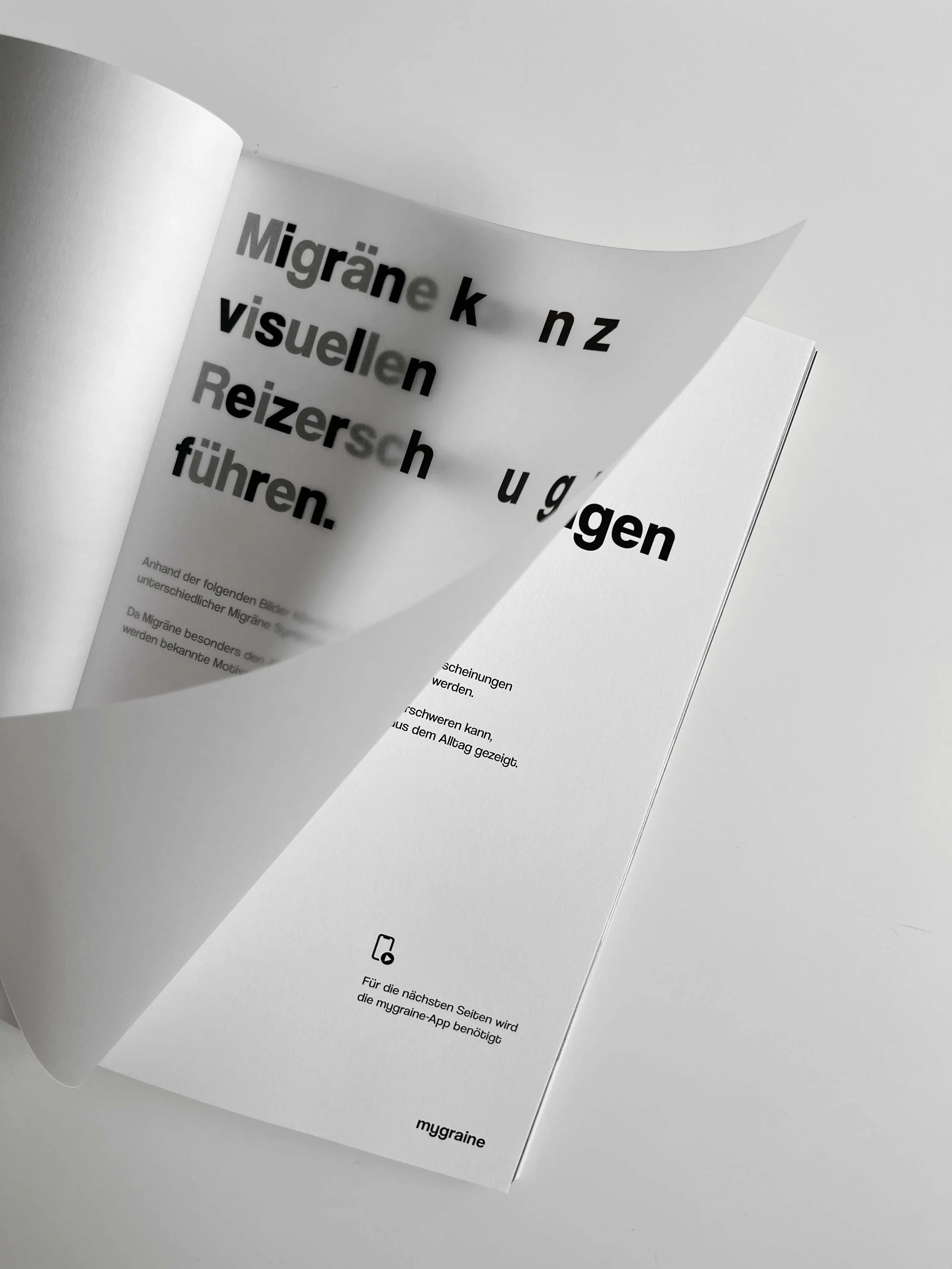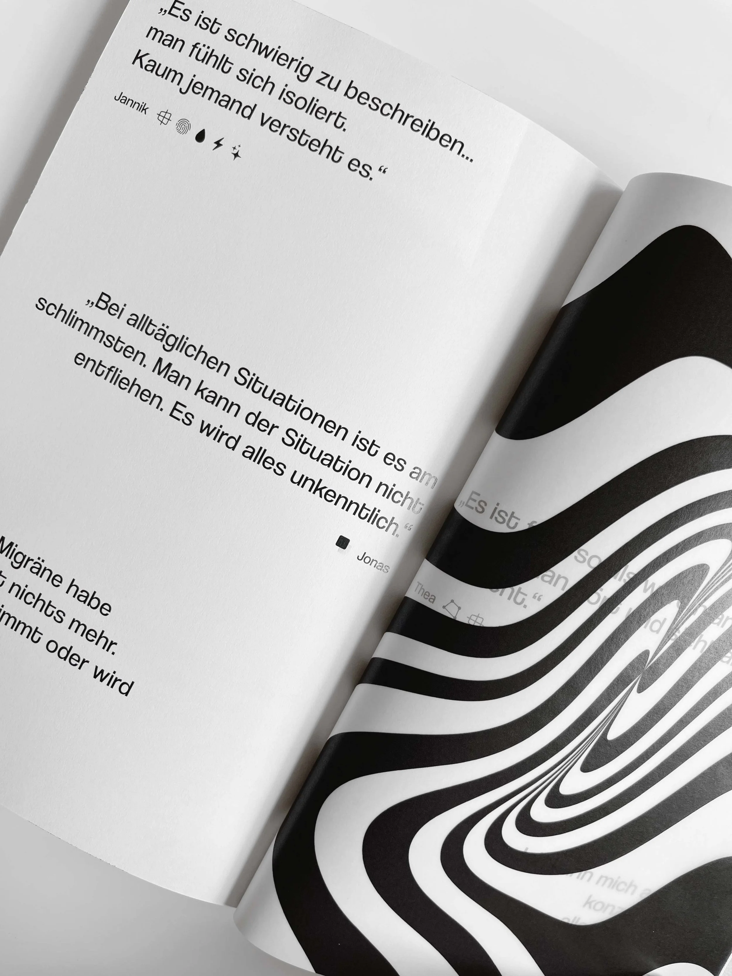 Für meine Bachelorarbeit habe ich mich mit Migräne, einer neurologischen Bewusstseinsstörung beschäftigt. Betroffenen fällt es oft schwer zu erklären, was während eines Migräneschubs passiert. mittels verschiedener Visualisierungen habe ich versucht zu zeigen, was sich Nichtbetroffene nur schlecht vorstellen können.